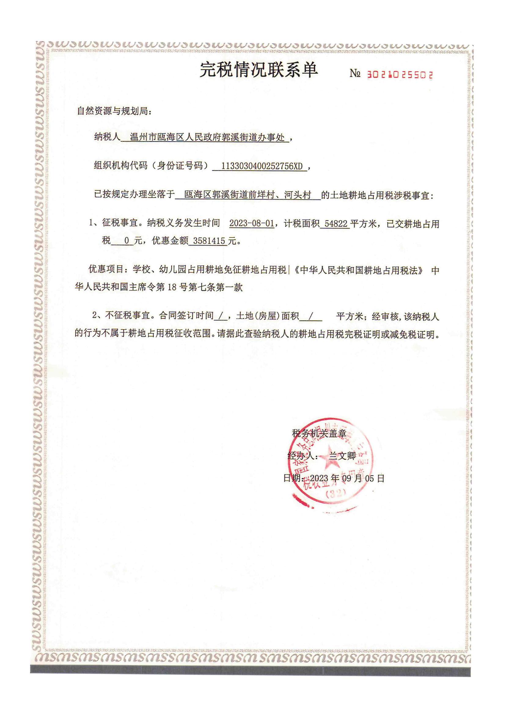 郭溪街道前垟村 瓯海职业中专集团学校迁扩工程一期(四)征地费用收据